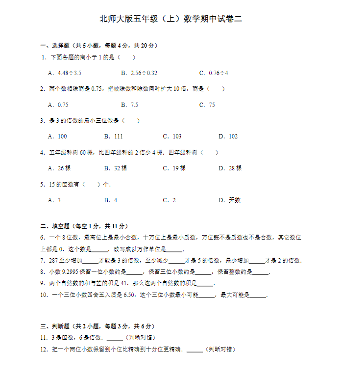 冀教版五年级(上)数学期末试卷二