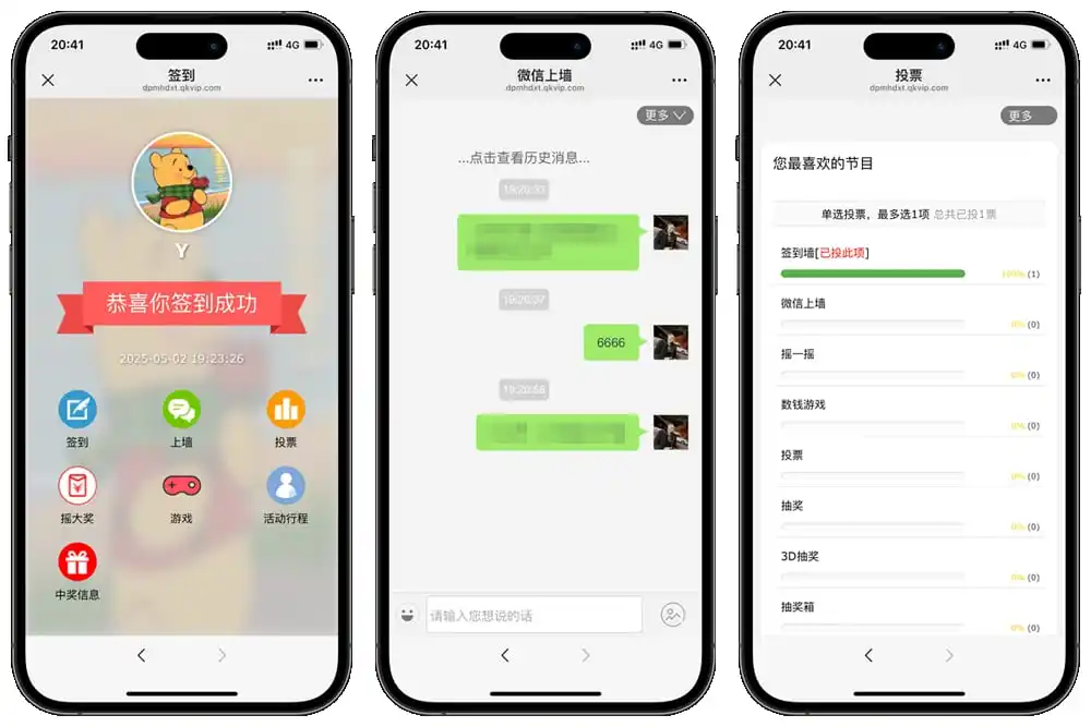 功能:签到、3D签到、投票、幸运号码、幸运手机号、对对碰、相册、开幕墙、闭幕墙、红包雨、瑶大奖、游戏等等